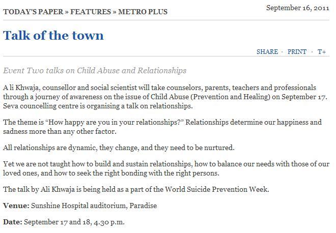 - Talk on Suicide prevention for Keshav Memorial College of Engineering, Hyderabad on September 12 by Rajendra Tapadia.